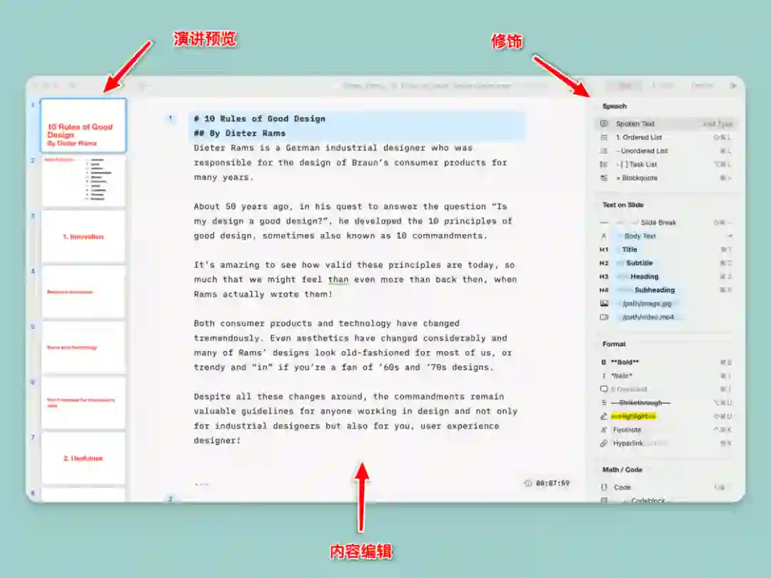 这个界面结合了格式选项和语法提示的功能,每一行既是功能按钮,又是一条列明了对应 Markdown 语法的「小抄」。令我感到惊喜的是,iA Presenter 的格式支持相当齐全,包括文本高亮、数学公式、表格等。