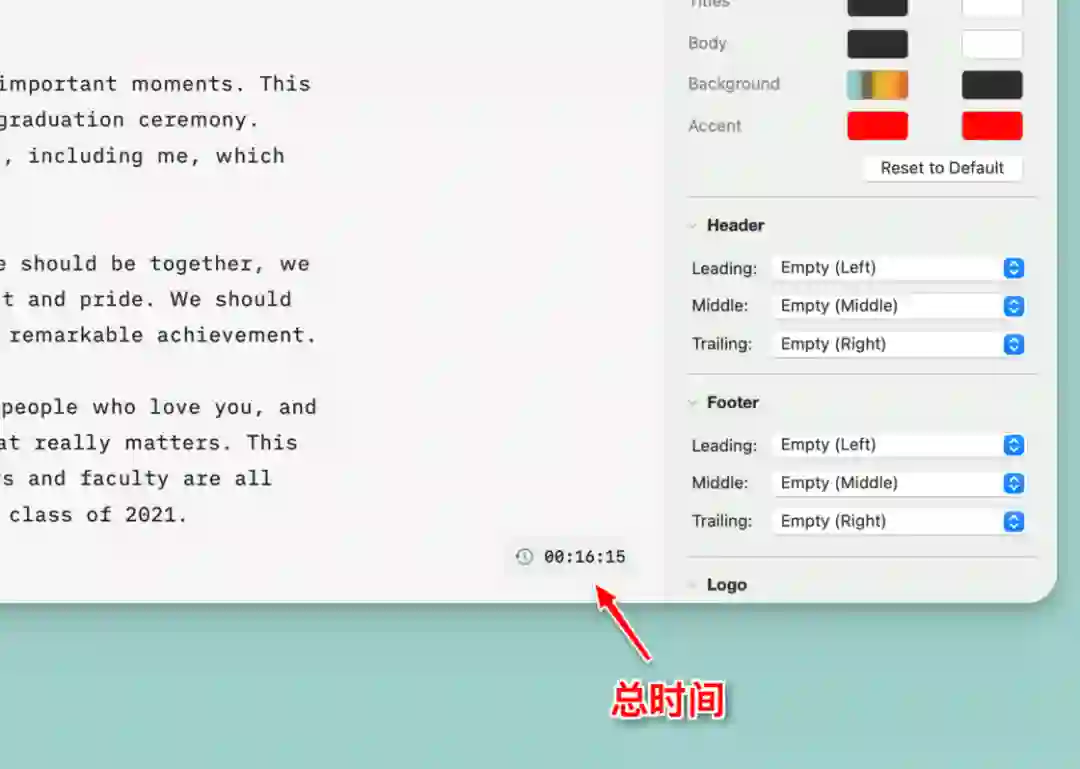 明确显示时间的好处在于,在写完稿件之后的演讲练习中,可以参考预估时间稳定语速,提高演讲能力和效果。在我的测试下,以大约是高中英语听力的语速念完文字,甚至还要比估计的时间稍快个 2 秒左右,反映出一种鼓励字正腔圆、娓娓道来的倾向。可惜时间估算目前仅支持英文,希望日后能加入其他语言的支持。