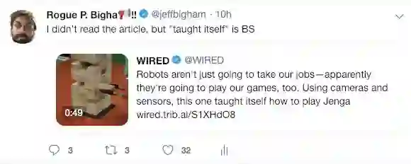 一台机器人不可能自己学习如何玩层层叠游戏。首先承认,我没读推文链接中的文章,但毫无疑问的是,有一帮家伙打算让一台机器人学会玩层层叠。人类,付出了巨大的努力,构建起一套复杂的系统,使得机器人能够利用某种数据进行自主学习。这些数据一般来自人类的亲身试验,或者由人类通过适当设置进行强化,从而确保机器人能够在“自己玩”的过程中掌握其中的诀窍。换言之,这一切,都需要人类的参与。