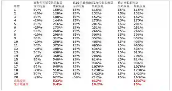 可以看到在这张表格的中间这一栏,每年都是15%的增长,到第二十年的时候,如果这个增长突然中断,假设这个年度的收益率回撤50%,在投资这二十年的过程当中,你如果有一年表现比较差,那么这二十年积累的总体收益相差是非常大的。