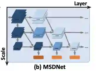 一种经典的方法上在常规卷积网络上添加中间预测层,如图a所示,当中间预测结果的置信度大于阈值,则提前退出。但早期的分类器没有利用深层的语义特征(低分辨率的高维特征),可能会导致明显的准确率下降。