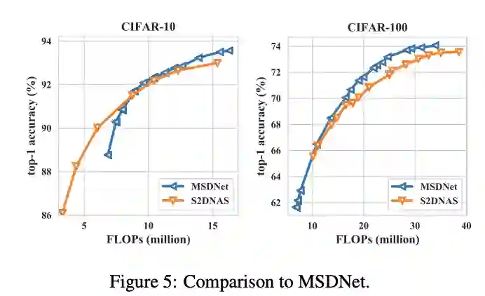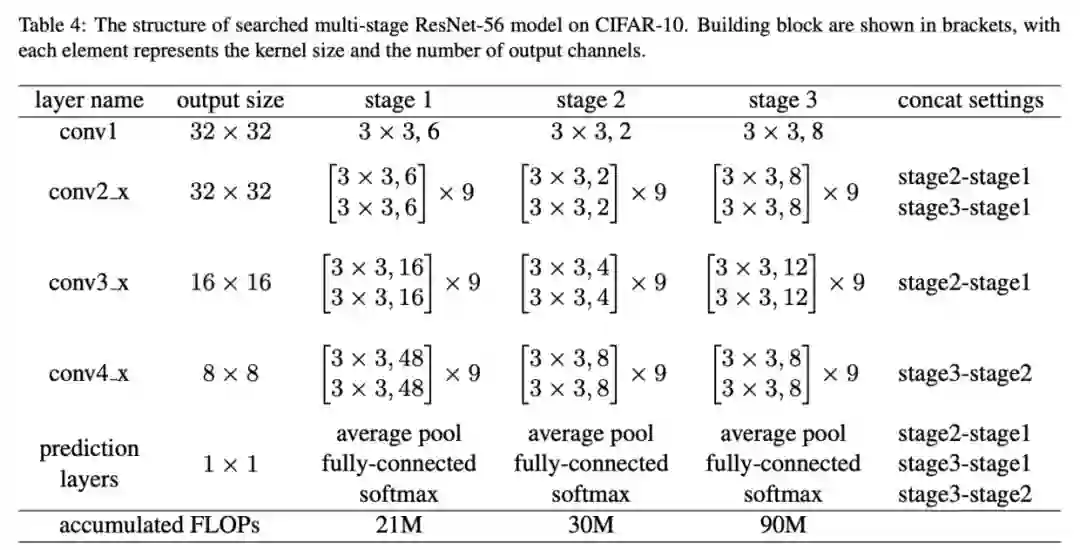 基于上面的两种转换操作,S2D可以生成包含丰富多阶段网络的搜索空间。不同分割点和指示矩阵有不同的意义,调整分割点能够改变分组特征的分配方式,从而改变不同阶段分类器在准确率和资源消耗上的trade-off,而调整指示矩阵则伴随特征复用策略的改变。为了降低搜索空间的大小,在实验时规定目标网络中相同特征大小的层使用相同的分割点和指示矩阵。