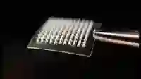 为了达到这一目的,科学家们先将药物装进直径约为250纳米的纳米颗粒中,然后,这些纳米颗粒被装进包含大量微针(microscopic needles)的一平方厘米大小的贴片上(如下图)。当被贴到皮肤上时,这些微针会无痛地刺入皮肤中,逐步从纳米颗粒中释放药物到下面的组织中。