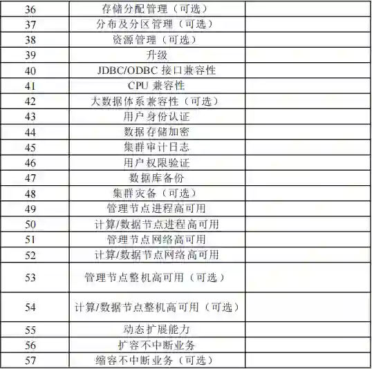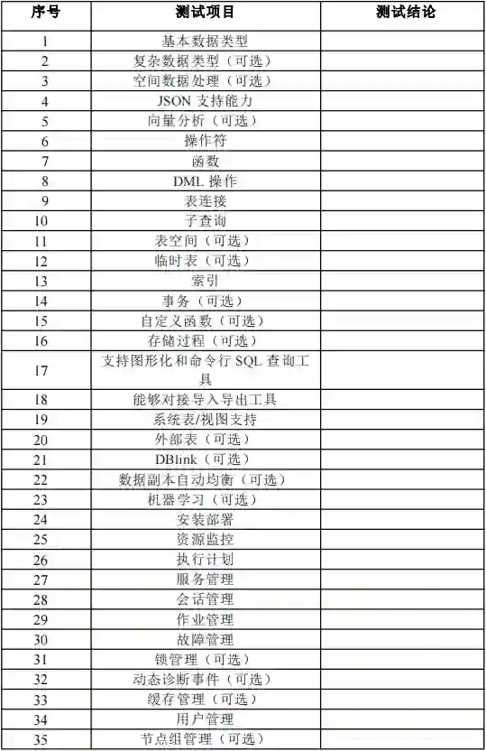而每种类型数据库的测试包括功能、性能、安全性、稳定性四大项,涉及大概 20 - 30 个必选测试用例,以及 10 个左右的可选测试用例,整体设计参考了我国工信部发布的各类数据技术要求与测试方法标准文件。以分析型数据为例,其测试标准表如下: