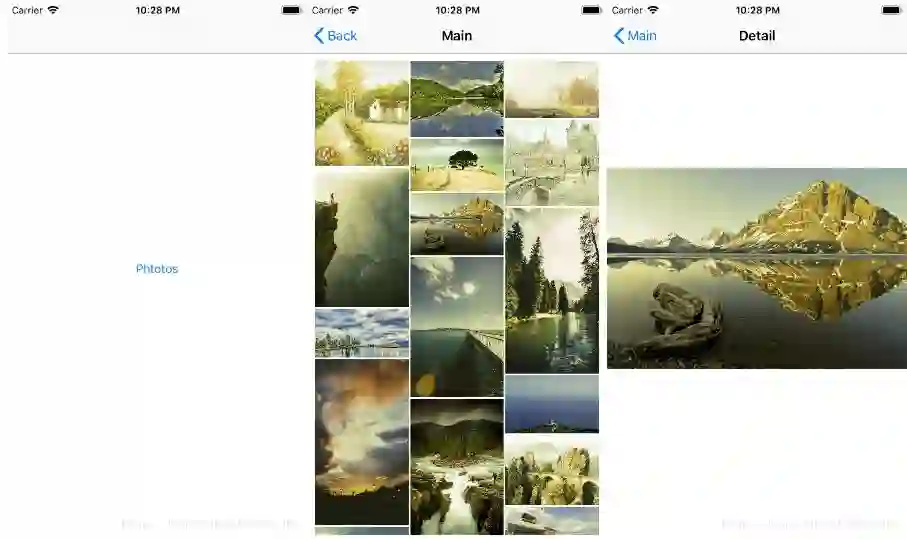 Demo是一个简单的图片应用:首页只有一个简单的入口;次级页面会读取本地图片,加滤镜,然后按照瀑布流的方式显示出来;第三个页面提供大图显示;