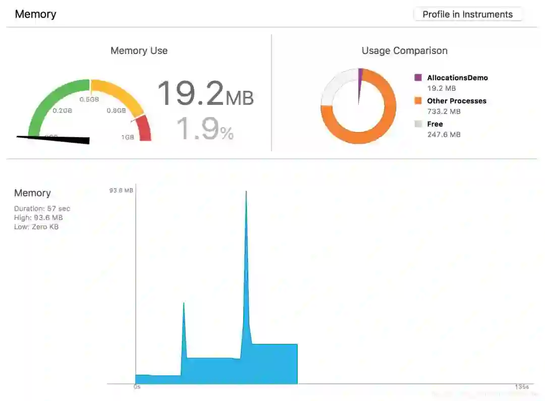 菜单栏选择Product -> Profile,然后选择Allocations,运行项目,按照内存飙升的路径重复操作,采集到内存数据后停止运行。