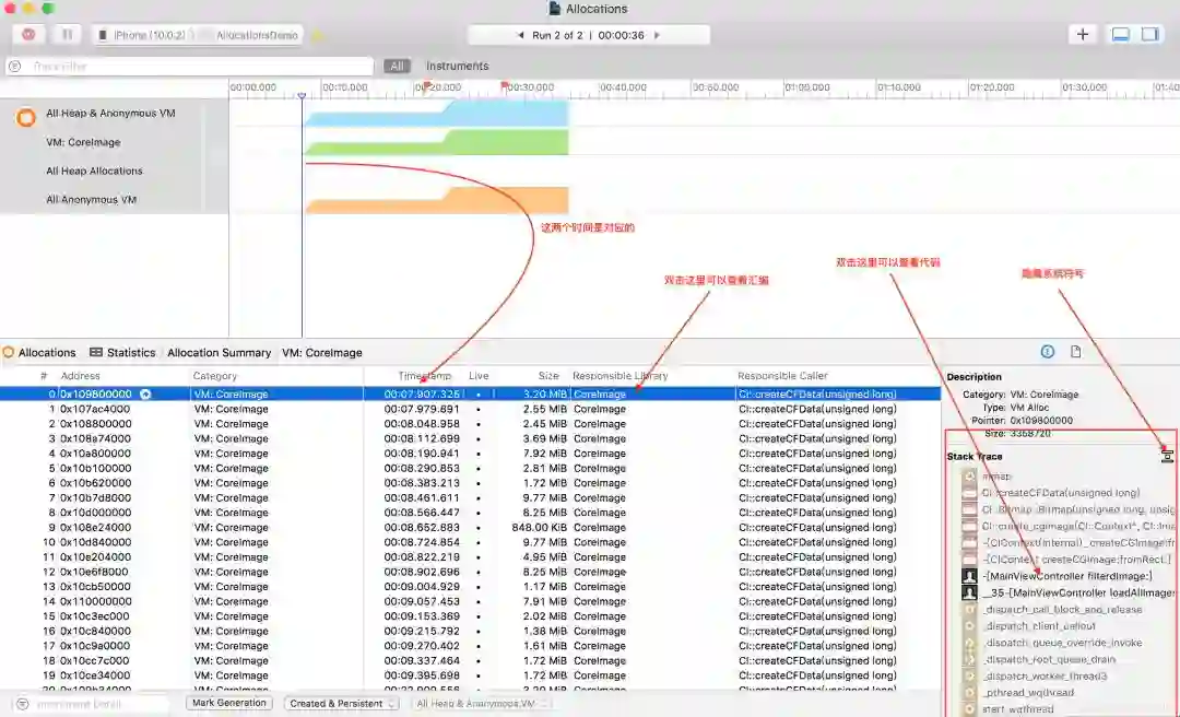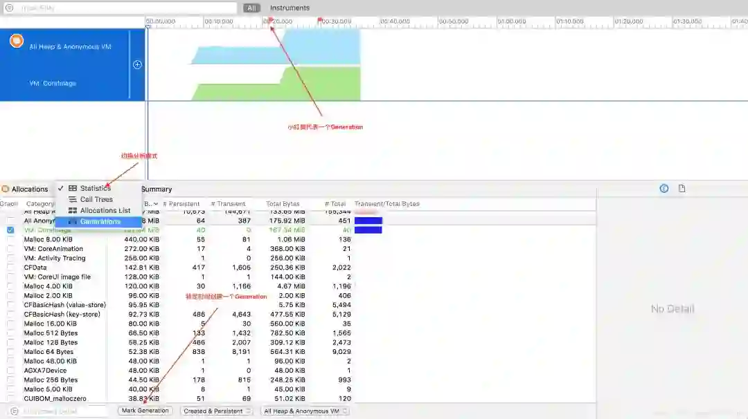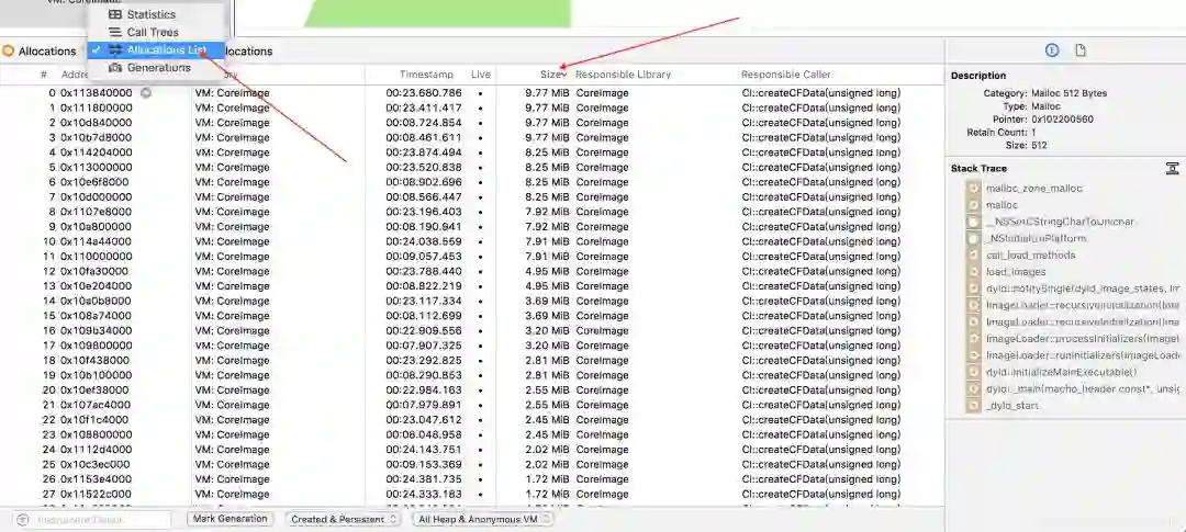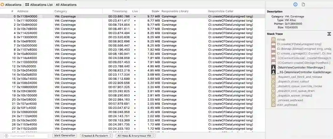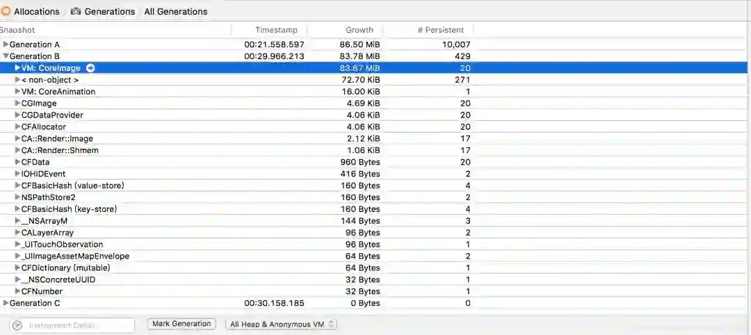 点Statictis,从下拉列表中,选择Generations,我们就可以看到内存增量主要在VM: CoreImage中,这里的每一行也可以点击查看详情,或者在右侧查看栈:
