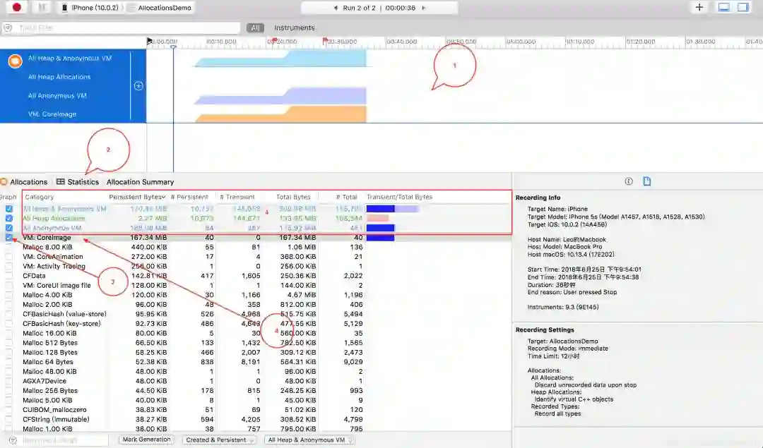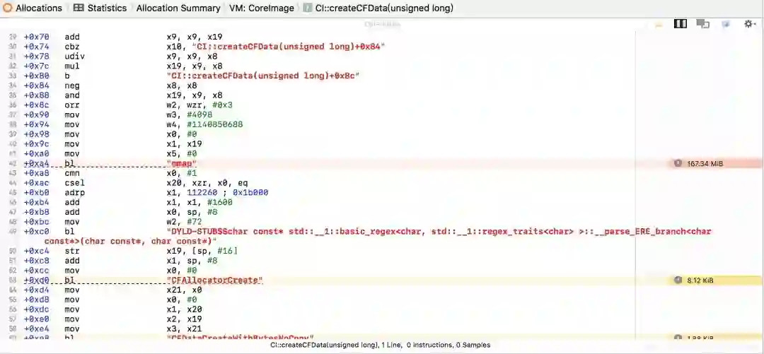 All Anonymous VM 匿名的虚拟内存区域。何为匿名呢?就是Allocations不知道是你哪些代码创建的内存,也就是说这里的内存你无法直接控制。像memory mapped file,CALayer back store等都会出现在这里。这里的内存有些是你需要优化的,有些不是。