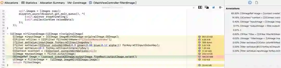可以看到,排名前几的内存块都是VM:CoreImage,从名字也就不难看出来,这是图片引起的内存。