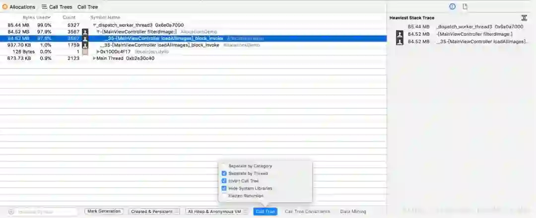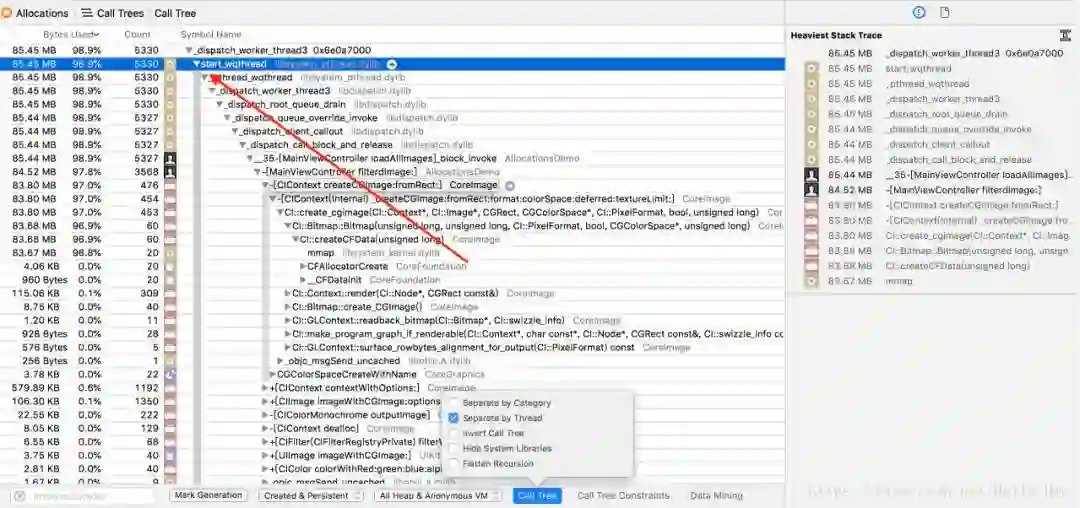 按照类似的方式,这次我们选择Call Tree来直接分析代码是如何创建内存的,勾选Separator By Thread,按照线程来对内存进行分类: