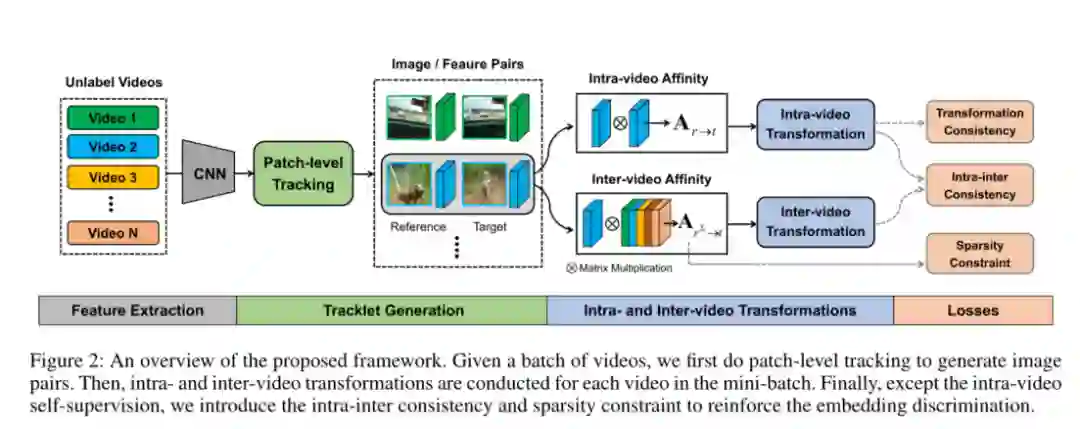 摘要:在本文中,我们专注于使用未标记的视频来进行视觉对应性自监督学习。我们的方法同时考虑了视频内和视频间表示关联,以进行可靠的对应估计。视频内学习通过帧对相似性在单个视频内的各个帧之间转换图像内容。为了获得实例级分离的判别表示,我们在视频内分析的基础上,构建了视频间亲和性,以促进跨不同视频的对比转换。通过强制视频内和视频间级别之间的转换一致性,可以很好地保留细粒度的对应关系,并有效地增强实例级的特征辨别力。我们的简单框架优于包括视频目标跟踪(VOT),视频目标分割(VOS),姿势关键点跟踪等在内的可视任务的自监督通信方法。值得一提的是,与完全监督的亲和力表示(例如ResNet)并执行与针对特定任务(例如VOT和VOS)设计的最新有监督算法相比,我们的方法也具有相应的竞争力。