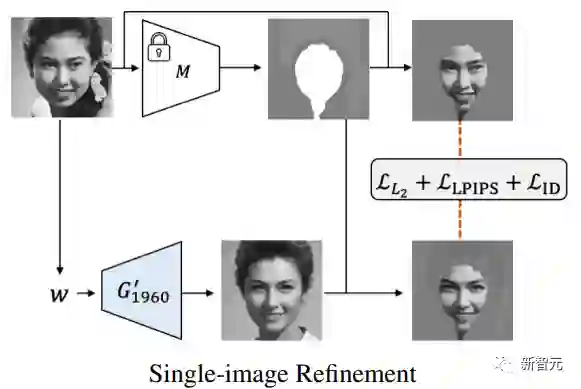 之后,每张真实图像被投射到十年流形上的一个向量w上(下图中的1960)。在该向量上,生成器G′t被训练来将精细化细节转移到所有的子模型上。最后,在输入图像上应用一个掩码,以鼓励模型保留人像的面部细节。
