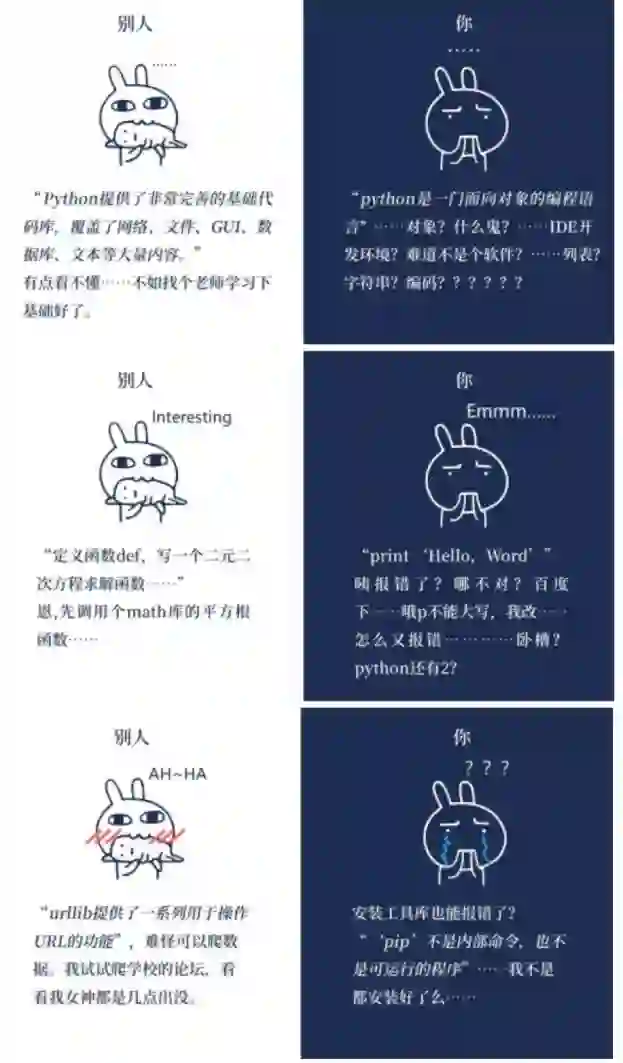 买了一本 Python 入门书,翻看了 20 页;收集了 20G Python 练习资料,保存在硬盘里;看了一些视频跟着写了会,突然就开始看剧了,导致放弃。这些情况是初学者很容易碰到的,学习是反人类的,Python 学习更是一项前期很枯燥的行为。