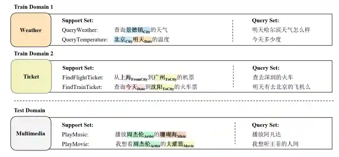 如图2所示,在FewJoint上实验时,模型先在训练domain上学习通用的先验知识。然后在每个测试domain上,模型根据少量support set中的样例,预测查询集中的样本的用户意图(Intent)和语义槽(Slot)。