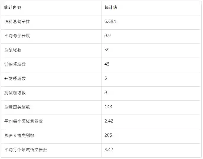 在对每一条数据进行用户意图和语义槽标注后,我们将所有59个domain分成3个部分:45个训练domain,5个开发domain,9个测试domain。我们将测试和开发domain数据重构为小样本学习形式:每个domain 包含一个人工构造的K-shot 支持集(support set),以及一个由剩余其他数据组成的查询集(query set)。