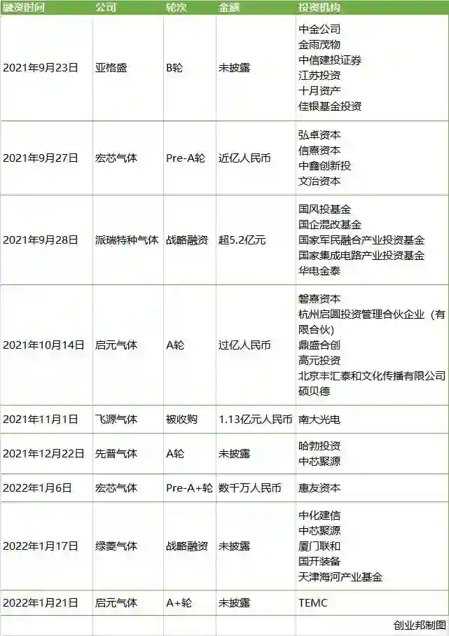 尤其是2021年9月,一个月间融资三起,融资规模近10亿元。其中,派瑞特种气体获得了来自国风投基金、国企混改基金等“国家队”在内的5.2亿元资金。