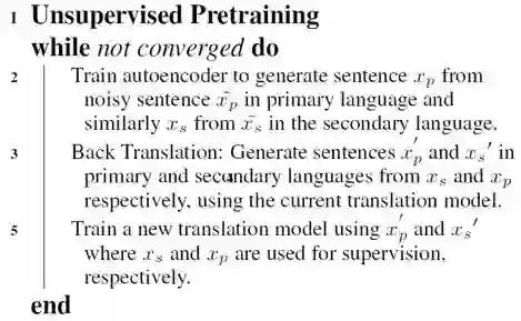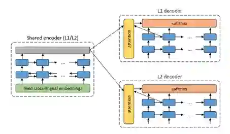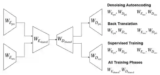 1. 使用无监督模型,将单语primary与secondary文本训练编码到一个共享潜在空间中.