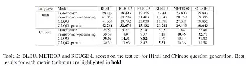 在印度语的问题生成实验中,CLQG+parallel 模型均取得了最优结果,但是在中文 QG 实验结果上,增量模型的效果并不突出,但整体上能够反映出英语语料对于中文问题生成能够带来提高。
