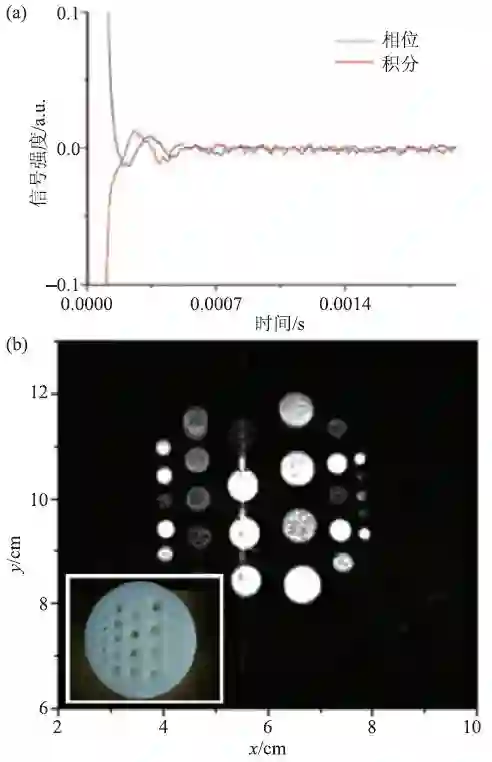 图8 (a) 3 ml 的CuSO4溶液的自由感应衰减信号[32];(b)一个带孔的塑料球的图像,孔内注有液体。插图为带孔塑料球[27]