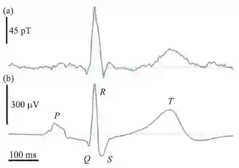 图5 (a)GMR/超导复合式磁传感器获得的心磁信号;(b)心电图测试结果[24]