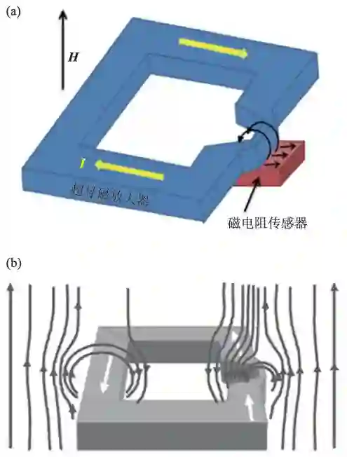 图1 (a)磁电阻/超导复合式磁传感器结构示意图;(b)超导磁场放大器原理图[13]