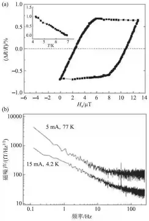 图3 (a)GMR/超导复合式磁传感器的磁阻曲线;(b)器件在77 K和4.2 K下的低频噪声频谱[11]