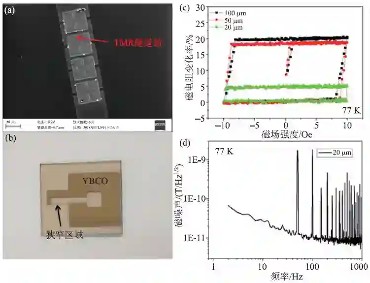 图9 (a)TMR 串联器件扫描电子显微镜照片;(b)超导磁放大器显微照片;(c)狭窄区域宽度为100 μm、50 μm和20 μm的TMR/超导复合式磁传感器在7 K的TMR曲线;(d)TMR/超导复合式磁传感器在77 K的低频噪声[34]