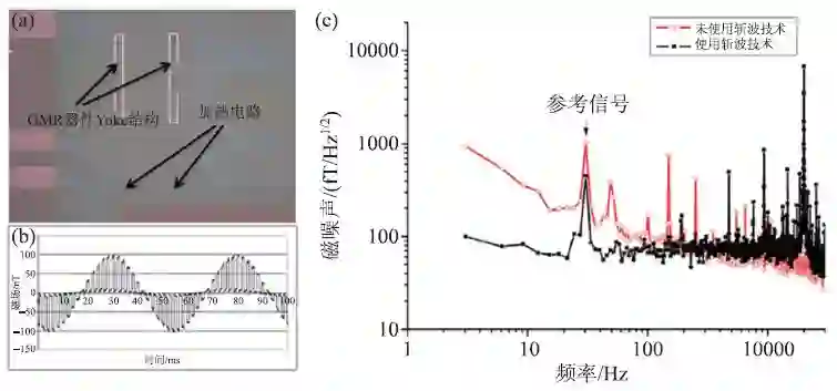 图4 (a)GMR磁轭结构设计;(b) 利用斩波技术测得的100 nT正弦波信号[21];(c)未使用斩波技术和使用斩波技术时GMR/超导复合式磁传感器的低频噪声信号对比