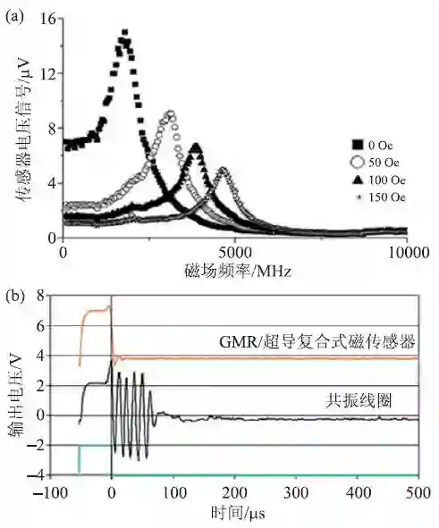 图7 (a)不同磁场下复合式传感器信号随频率的变化;(b)GMR/超导复合式传感器与共振线圈在800 kHz 时对50 μs 脉冲的响应恢复[26]