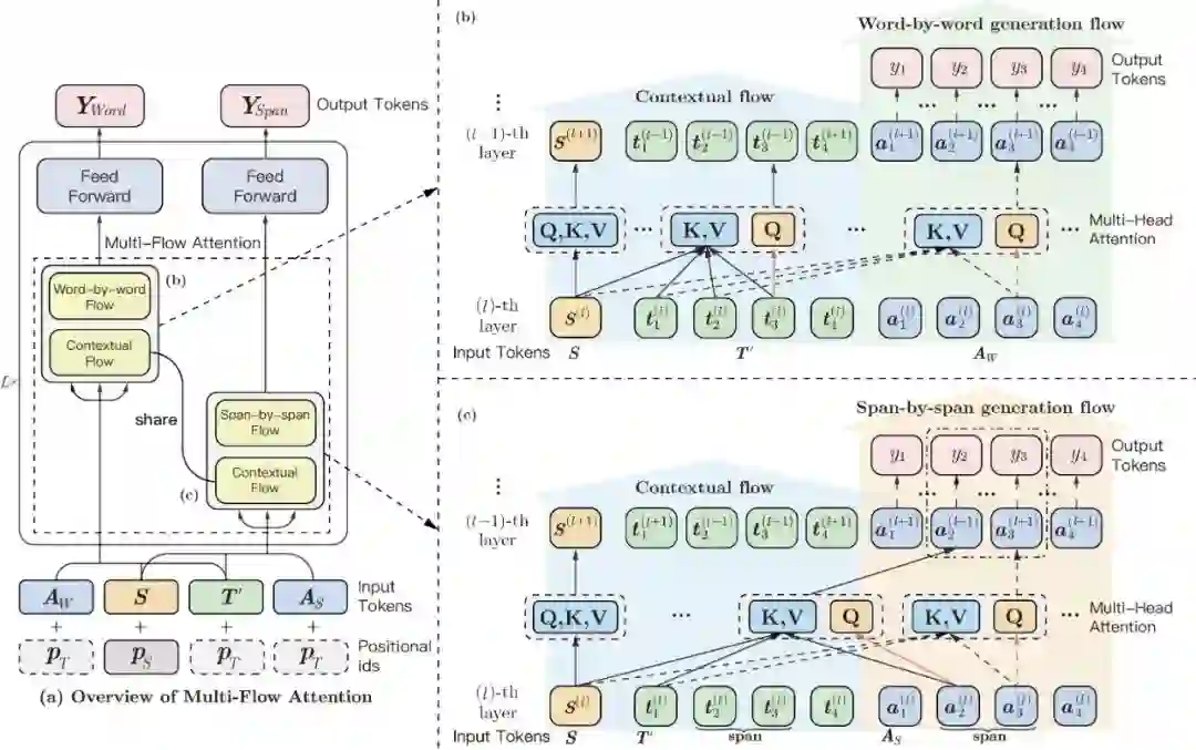 「Contextual Flow」中 是双向可见的, 是单向可见的 (seq2seq);而「Word-by-word Flow」中的符号序列 不能看见相同位置的目标字符;「Span-by-span Flow」中,符号序列 不能看见同一个span中的所有目标字符,如图中的 。