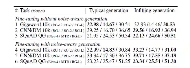 当finetune不加噪声时,Infilling generation机制在CNN/DM-10k和SQuAD上较传统机制更好,但在Gigaword-10k上持平;当finetune加入噪声时,两种生成机制的效果都有明显的提升,且infilling机制在摘要生成任务上的涨幅为明显。
