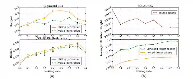 左图指出,infilling generation机制在不同的噪声 比例下,都较传统生成机制性能更好;为了进一步说明噪声对生成训练起的作用,论文中分析了不同噪声比例下,比较了encoder字符、未加噪的decoder字符和加噪的decoder字符在最后一层的平均attention权重。有意思的是,随着噪声比例增加,模型将更多的注意力分配到decoder端,用于检测decoder端的错误,并且给错误的字符分配更小的权重,给正确的字符分配更高的权重,从而增加了生成的鲁棒性。