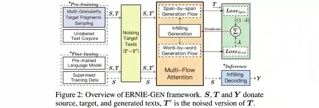 针对以上3个问题,ERNIE-GEN提出一套基于Multi-Flow attention结构的预训练和微调框架:
