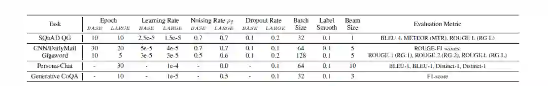 ERNIE-GEN使用和BERT、UnilM相同的训练数据(16G),base和large模型分别用BERT-base和BERT-large热启,训练40W步左右。预训练阶段,在decoder输入序列中加入比例为 的噪声。ERNIE-GEN在最近补充了用160G预训练数据(同Roberta)下的模型性能,多个生成数据集上取得了SOTA。