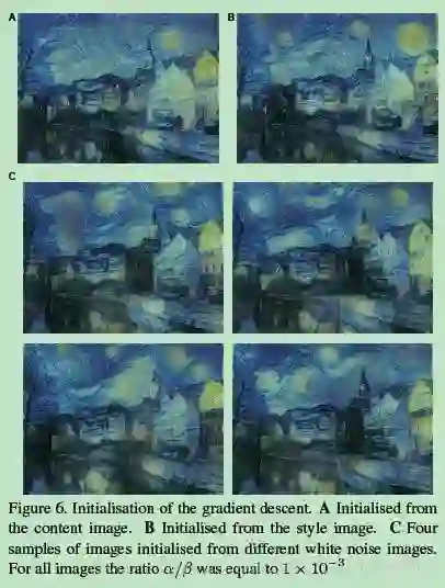 Figure6是关于初始化的比较。在文中(Figure2)是采用随机生成一个白噪声图像来初始化的,在文中作者也对比了其他初始化方法,比如用style image初始化或用content image进行初始化。结果表明不同的初始化方式对最终的结果没有太大的影响。每次随机初始化都会生成不同的结果,如Figure6中的C有4张。但是用style image或content image初始化生成的结果是固定的。