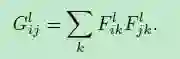 这里我为了书写方便用a表示Figure2中的a箭头,p表示p箭头,x表示x箭头。Figure2的左边,a表示风格图像(style image),a作为VGG网络的输入,这样VGG的每个卷积层都可以得到很多feature map,用Al表示,l表示层,因为输入是风格图像,所以这些Al可以称为style representation。这里每一层的特征Al都将被保存下来,可以看Figure2左边每个卷积层的右边都有一个箭头指向生成的feature map。Figure2的右边,p表示输入的待转换的图像(content image),同样作为VGG网络的输入,经过多个卷积和pool层,每层都会生成很多feature map,用Pl表示,并称之为content representation。这里只保存conv4层的feature map,可以看Figure2右边的conv4层的左边有一个箭头指向生成的feature map。至于为什么要采用高层信息,前面在介绍Figure1的时候已经解释了。Figure2的中间,x表示生成的随机白噪声图像,同样作为VGG网络的输入,这样每个卷积层都可以计算出style features Gl和content fetures Fl。这里的content features FI是每个卷积层的feature map,style features Gl是根据Fl利用Gram矩阵计算得到的,具体公式如下: