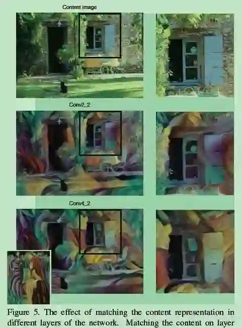 Figure5表示对于提取图像的content信息时采用高层或低层特征的效果对比。可以看出从Conv2_2提取的特征会更多地保留原图的细节信息。