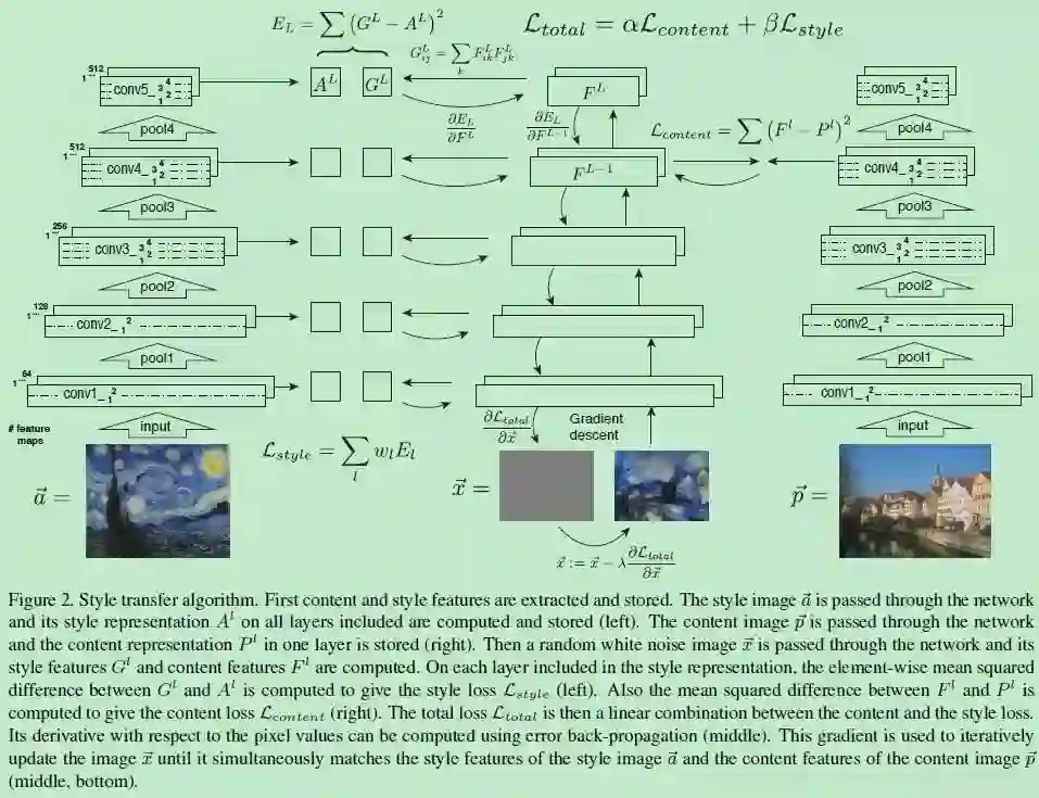 Figure2是本文算法的核心。先大概讲一下Figure2中最上面的右边的公式是网络训练的总的loss,这个loss包含congtent和style两部分,且都有系数来控制权重,接下来会详细介绍这个loss是怎么计算得到的。