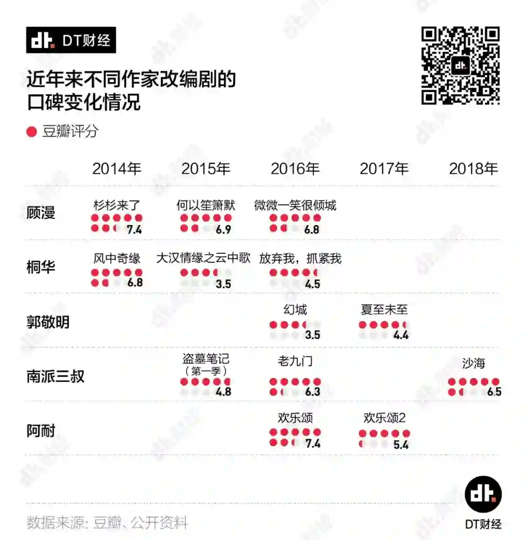 比如2014-2016年改编自顾漫小说的3部电视剧《杉杉来了》《何以笙箫默》和《微微一笑很倾城》,出品制作方都是剧酷传播,但口碑却从7.4分逐年下降到6.8分。