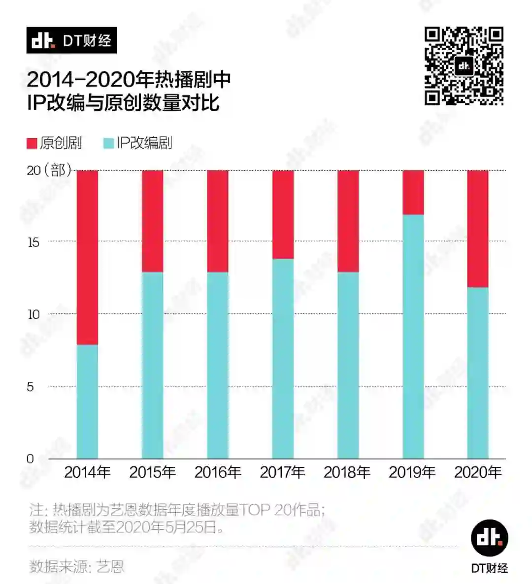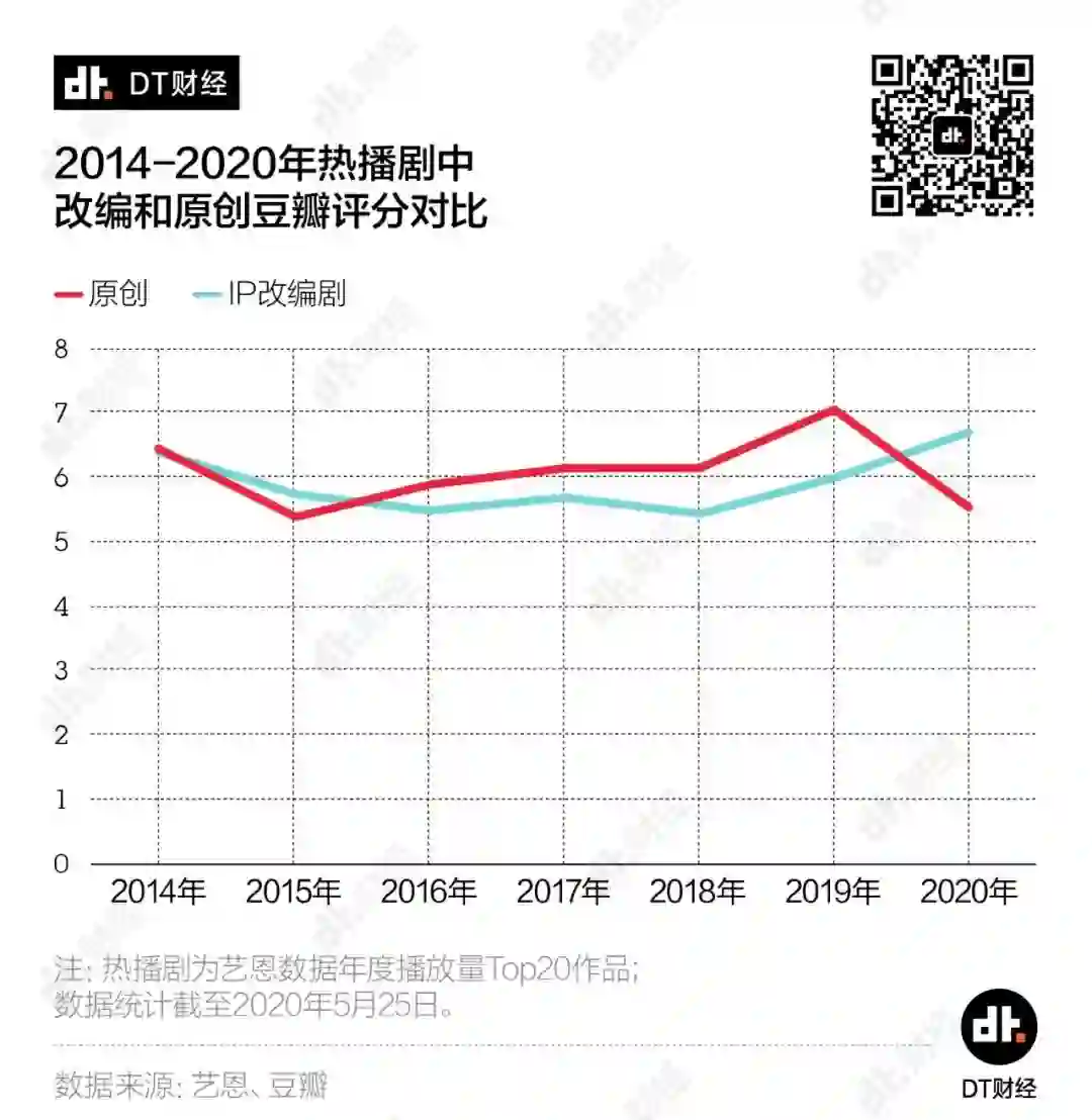 DT财经细数了2014年以来IP改编剧和原创剧的情况,想看看IP改编剧是怎样一步步垄断了我们的观剧选择?国产剧真的就离不开网文IP了吗?