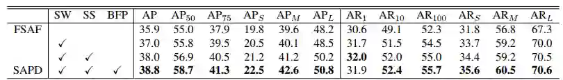 作者和FSAF(基于anchor-free分支)进行比较,soft-weighted anchor points(SW)策略提升了1.1个点,soft-selected pyramid levels(SS)提升了1个点。作者还采用了BFPN(2019 CVPR Libra RCNN中的特征融合策略)进行了加强,还能有性能提升。