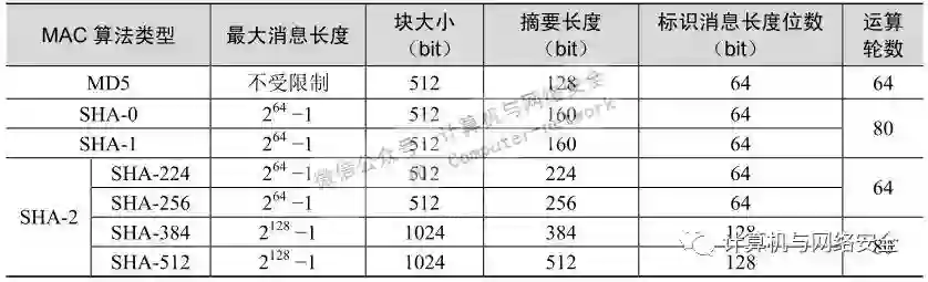 SHA(Secure Hash Algorithm,安全哈希算法)主要适用于数字签名,也是一种不可逆的MAC算法,但比MD5算法更加安全。目前它有三种主要的版本,即SHA-0、SHA-1、SHA-2和SHA-3。其中SHA-2和SHA-3版本中又有多种不同子分类,如在SHA-2中又根据它们最终所生成的摘要消息长度的不同又包括SHA-224、SHA-256、SHA-384和SHA-512等几种。