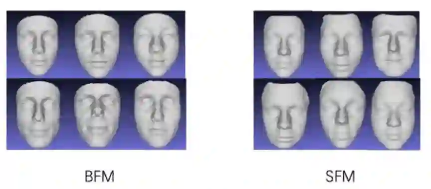目前开源的数据库主要有 BFM 跟 SFM 两个,同时还有一个 Facewarehouse 仅供学术研究使用,对比这些数据库,FACEGOOD 3DMM 主要体现在精度上,抛弃 kinect 这类民用级扫描技术,使用相机阵列的方式,可以完全重建人脸的所有肖像特征,如上图所示,图示 2 是 FACEGOOD 数据,图示 1 是 SFM 数据,后者在细节上损失很大,基本上只保留了人脸的大概特征。