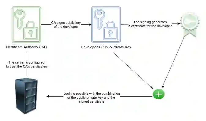 在服务器上,你只需告诉服务器你的 CA 的公钥,服务器就可以检测用户是否具有正确签名的证书,并且仅允许拥有这种签名证书的开发人员访问自己。