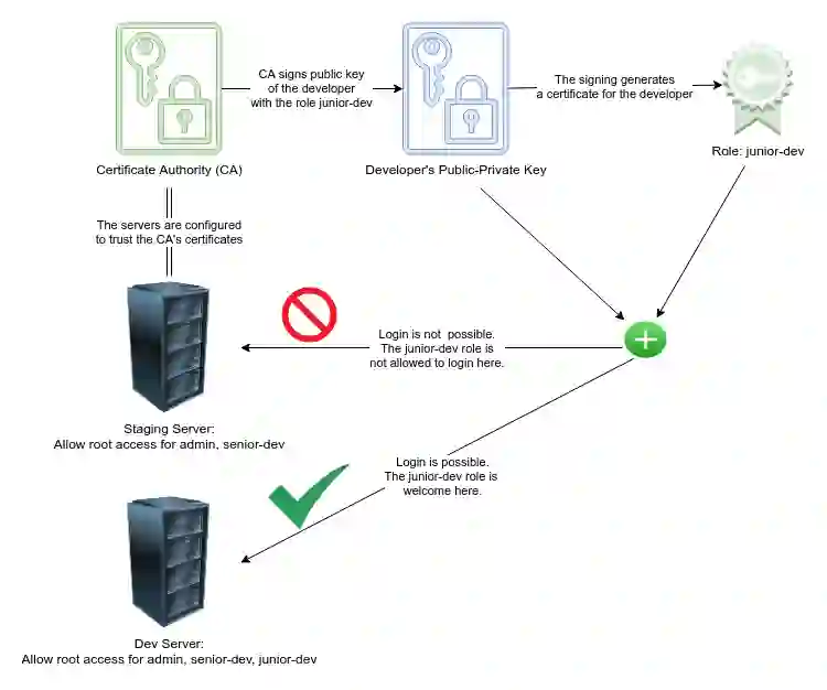 我认为这种解决方案是最好用的。你可以选择通过 ssh 基于角色管理对服务器的访问权限。你只需配置一次服务器(允许哪些角色访问服务器)即可。对于新加入的开发人员,你只需要生成一个签名证书,他们就能立即访问与他们的角色 / 经验相匹配的所有相关机器。当他们离开公司时,你也可以通过一种简单的方式撤销他们的访问权限。