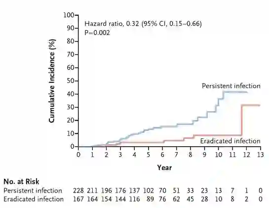 根据HP根除状态进行分析:在接受了研究药物治疗后3个月,167例患者成功根除了HP:其中治疗组156例(80.4%,156/194),安慰剂组11例(5.4%,11/202)。其余228例患者持续有HP感染。在中位随访5.9年,41例出现异时性胃癌的患者中,32例出现在有持续HP感染的228例患者中(14.0%),9例出现在167例HP根除的患者中(5.9%)。HP根除可以降低68%的异时性胃癌发生率(HR=0.32;95%CI:0.15-0.66;P=0.002),见下图2.