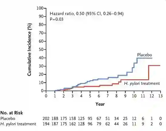 在中位随访5.9年后,治疗组患者出现异时性胃癌的患者共14例(7.2%,14/194),安慰剂组位27例(13.4%,27/202),抗HP治疗可以显著降低一半的异时性胃癌发生风险(HR=0.50,95%CI:0.26-0.94;P=0.03),见下图。