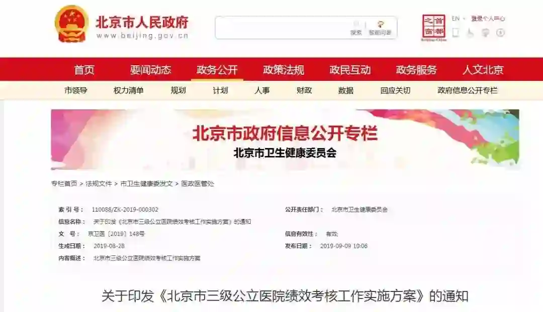 近日,北京市卫健委联合北京市发改委、市教委、市财政局、市人力社保局、市中医局、市医保局共同研究制定了《北京市三级公立医院绩效考核工作实施方案》(以下简称《方案》),明确北京市三级公立医院考核指标,并指出考核结果会与医院主要领导任命挂钩。