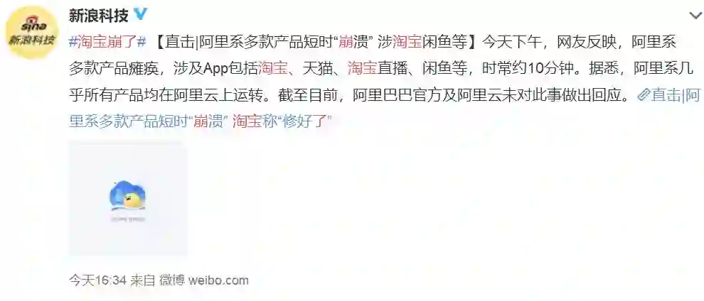 今天下午,微博、微信朋友圈多名网友爆料阿里系各个产品系统瘫痪的截图,其中包括:淘宝、聚划算、天猫、闲鱼、千牛、飞猪......时长约为10分钟左右,据了解阿里系产品都运行在阿里云上