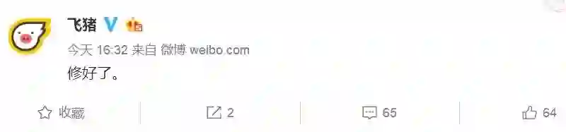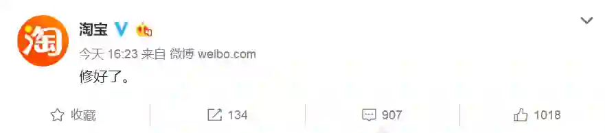 直至下午16:23分,微博@淘宝、@飞猪 发布微博表示:修好了。知情人士称,此次问题,影响阿里系10多个产品线,不过具体原因并没有说明